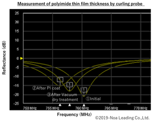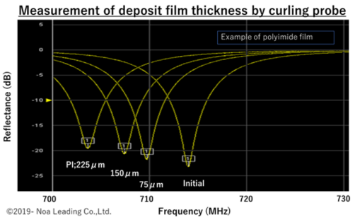 The following shows an example of measuring a thin polyimide film attached to the front glass of acurling probe as an application of the above measurement method.This measurement was made by examining the change in resonance frequency when a polyimidesolution was sprayed on the front surface of the glass of the curling probe and then dried in avacuum dryer.@ is the initial absorption frequency. When the polyimide solution is spray-coated on the curlingprobe, a thin film of polyimide solution is formed on the front glass surface of the curling probe,and the resonance frequency shown in A is obtained.After that, when the solvent of the polyimide solution is vaporized and evaporated with a vacuumdryer, the polyimide solvent film contracts and the resonance frequency increases, which can bemeasured as shown in B.In this experiment, spray coating was performed, but in actual manufacturing equipment, the filmthickness of the deposit on the side wall can be measured by installing a curling probe on the sidewall in the chamber.This principle enables deposit management in the chamber. Expected to be applied to dustmanagement and foreign matter management in the chamber. |